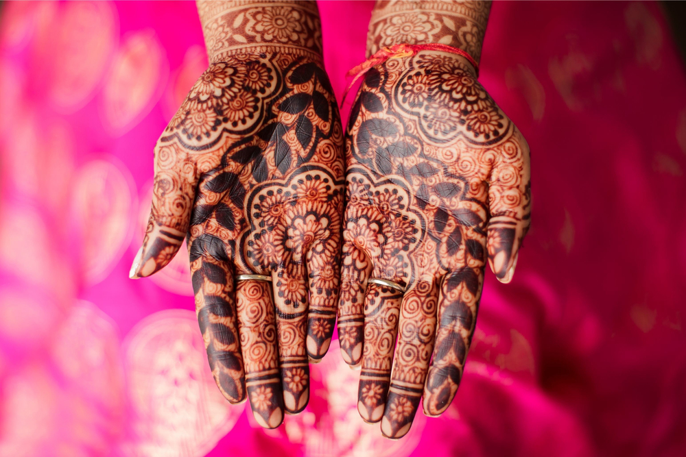 Back of hand, fingers and forearm of Indian bride resting while mehndi is drying